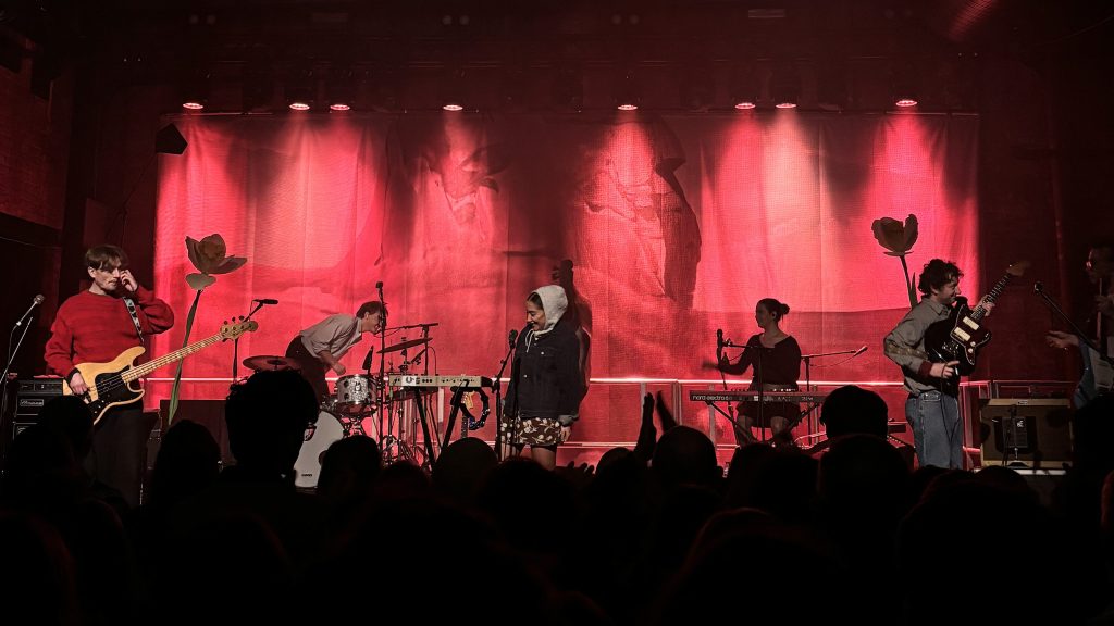 This is an art exhibition, as much as a gig. Four daffodils corner the stage, illuminated by strobes against a backdrop depicting a painting of Ilkley’s Cow and Calf Rocks – the painting found on the album cover of their Mercury award winning album, This Could Be Texas. It is courtesy of Gilly Fontaine-Grist – frontwoman Lily Fontaine’s mum, and hangs behind an abstract sculpture, which is also found on the album cover. It is the perfect embodiment of their aesthetic, which flows out of their music in droves.